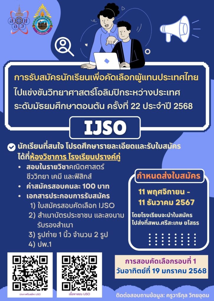 ขอเชิญนักเรียนโรงเรียนปรางค์กู่ ชั้นมัธยมศึกษาปีที่ 1-3 ร่วมสมัครสอบคัดเลือกเป็นผู้แทนประเทศไทยไปแข่งขันวิทยาศาสตร์โอลิมปิกระหวางประเทศ ครั้งที่ 22 (IJSO 2025)