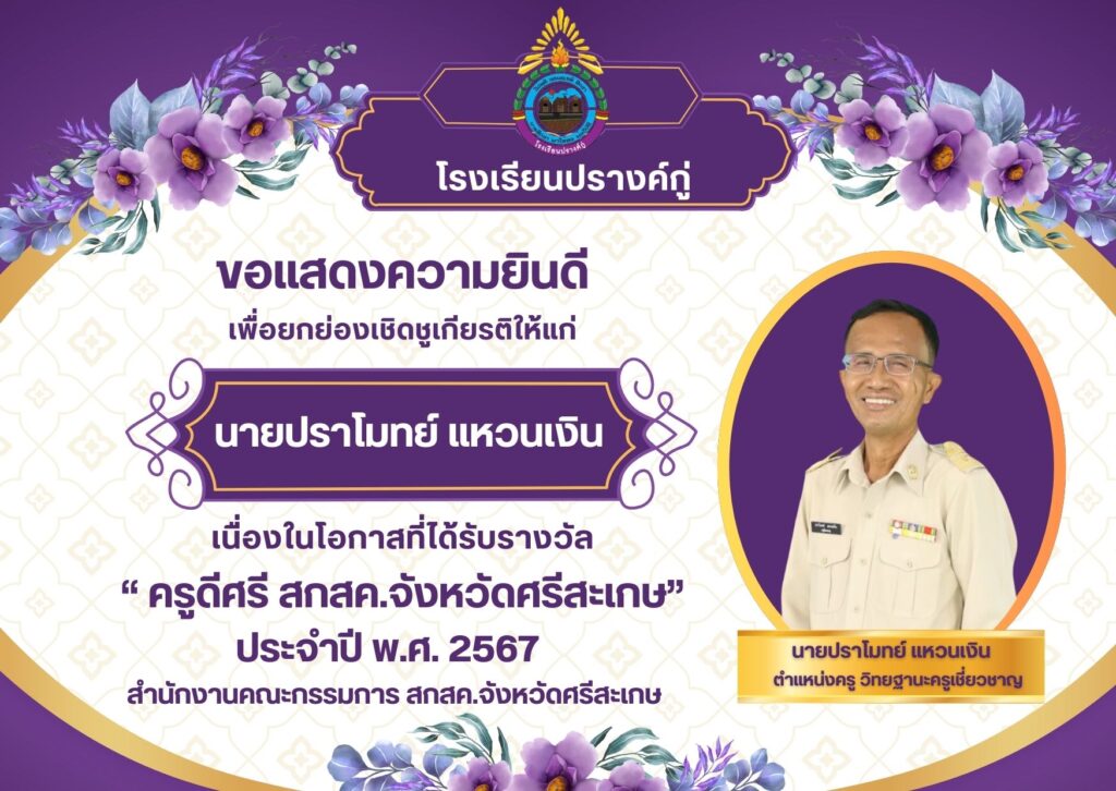 คุณครูปราโมทย์ แหวนเงิน ได้รับรางวัล “ครูดีศรี สกสค. จังหวัดศรีสะเกษ“ ประจำปี พ.ศ.2567