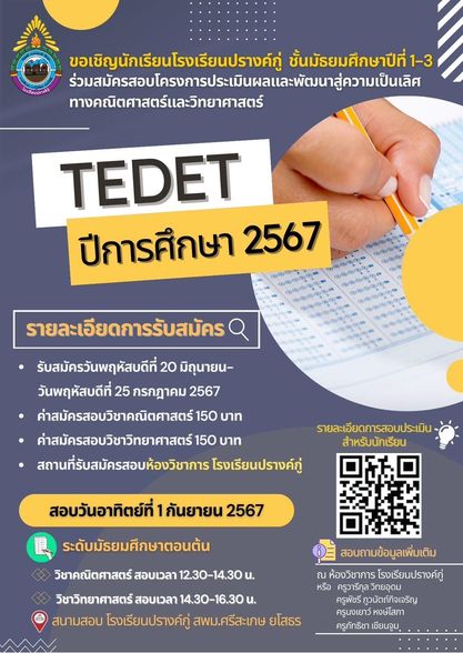 ขอเชิญนักเรียนโรงเรียนปรางค์กู่ ชั้น ม.1-3 ร่วมสมัครสอบโครงการประเมินผลและพัฒนาสู่ ความเป็นเลิศทางคณิตศาสตร์และวิทยาศาสตร์ (TEDET) ปีการศึกษา 2567โดยadminวันที่21 มิถุนายน 256719 กรกฎาคม 2024